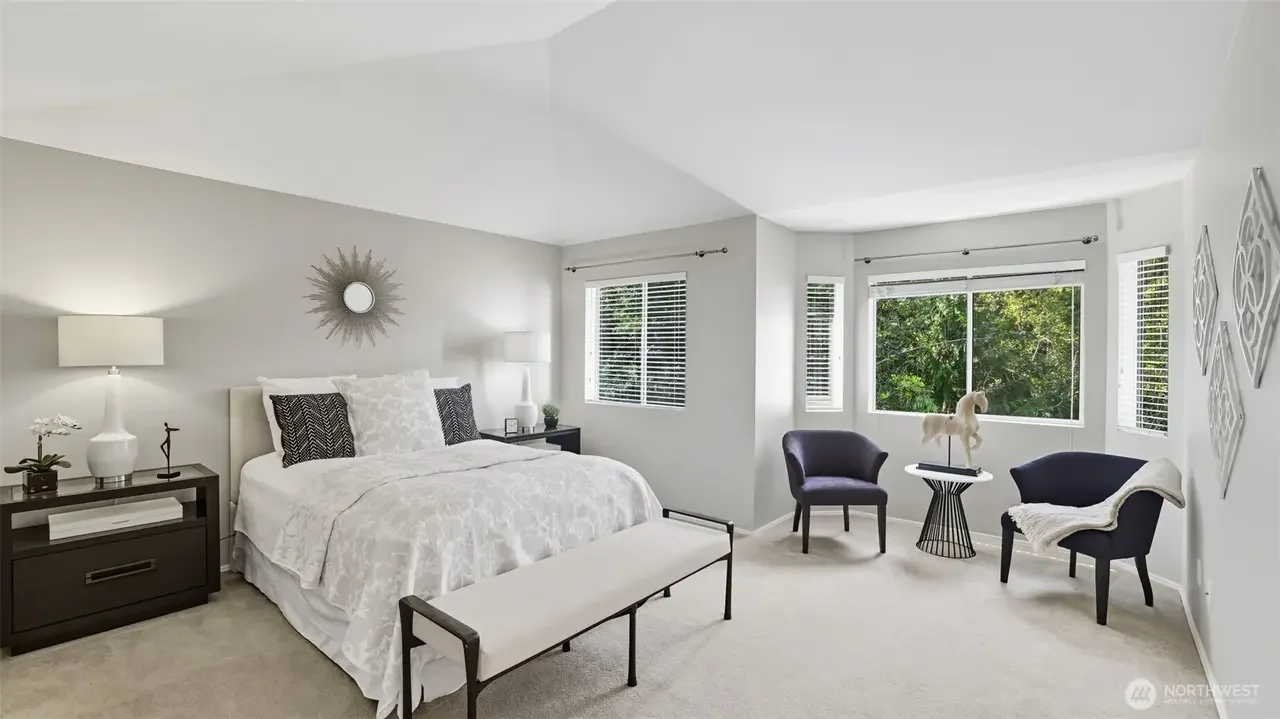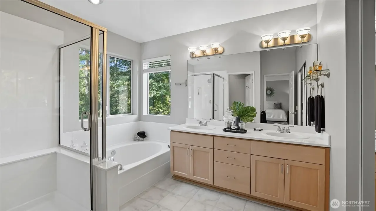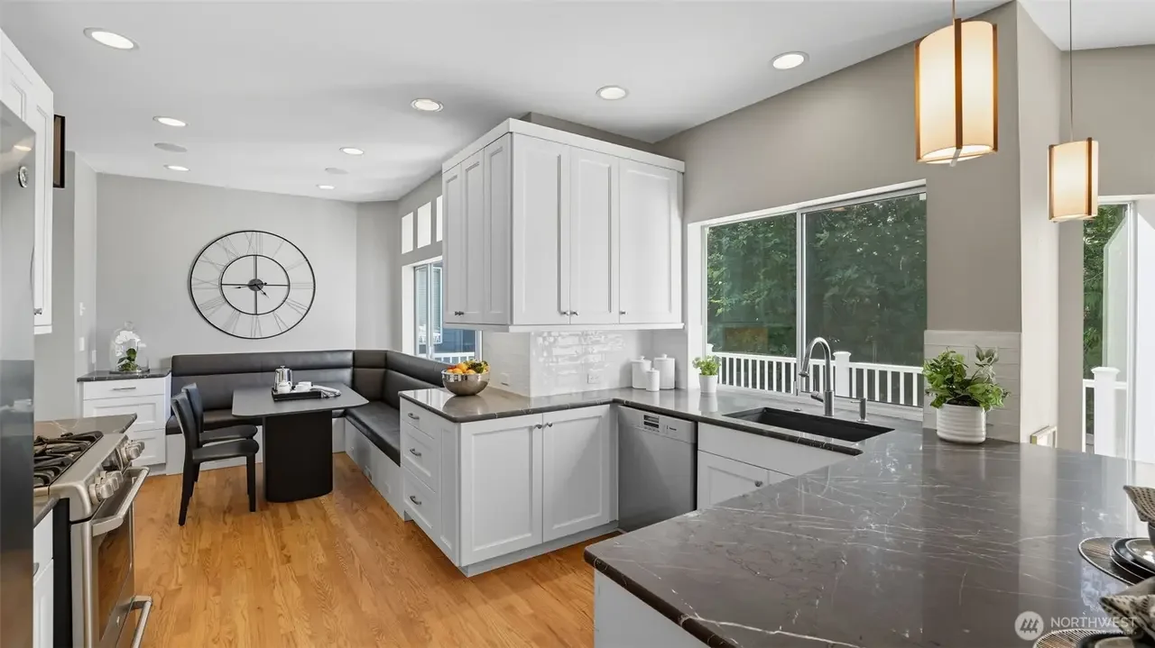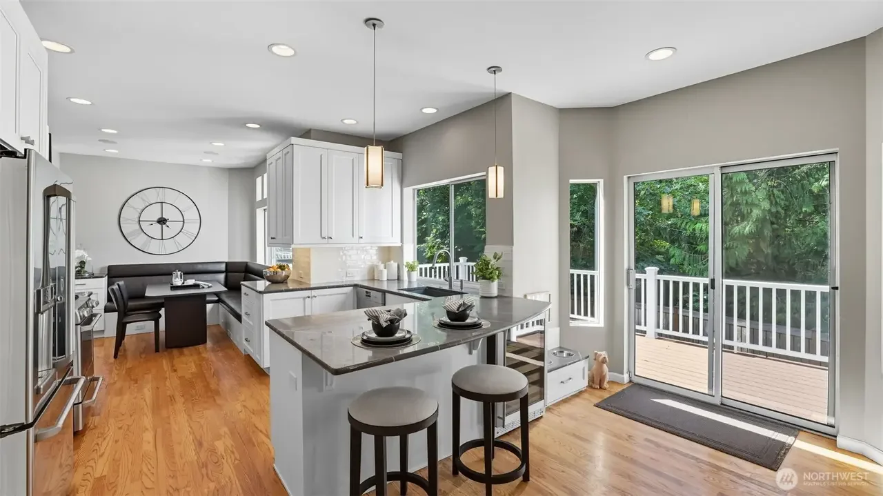 Updated 4-bedroom home on a quiet street in The Willows backing to a lush greenbelt. Vaulted ceilings and skylights fill the home with natural light. Real hardwood floors flow through the main living areas, complemented by plantation shutters in the formal rooms. The remodeled kitchen features Pietra Grey marble counters, glass tile backsplash, and high-end appliances with gas and electric cooking. The family room offers a slate-surround wood-burning fireplace and large TV that stays. The primary suite includes a sitting area, French doors, and a luxurious 5-piece bath with heated tile floors. Enjoy a fully fenced yard, large Trex deck, & access to Klahanie’s pools, parks, trails. Top-rated Issaquah schools. Pre-inspected.